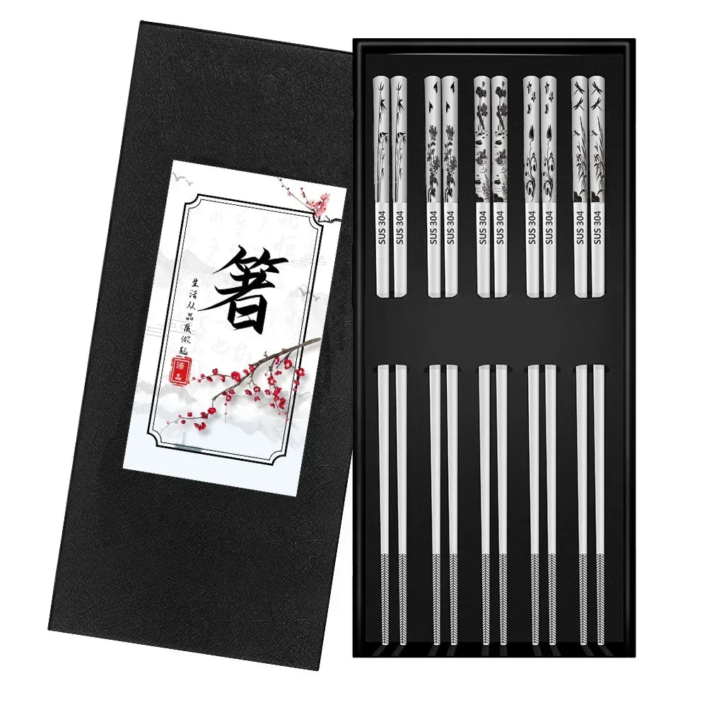 - Elevate your dining experience with this premium set of five pairs of laser-patterned 304 stainless steel chopsticks.